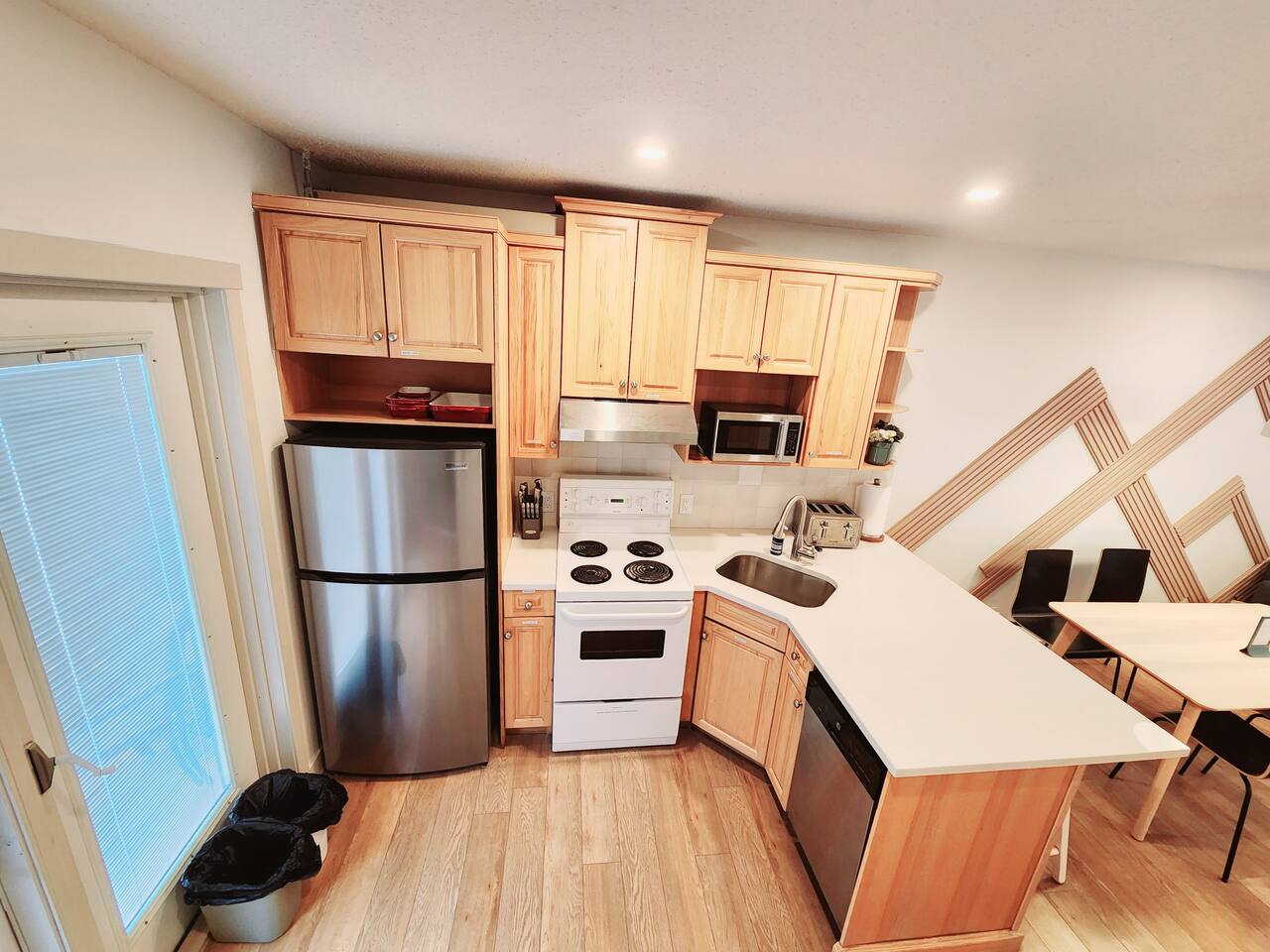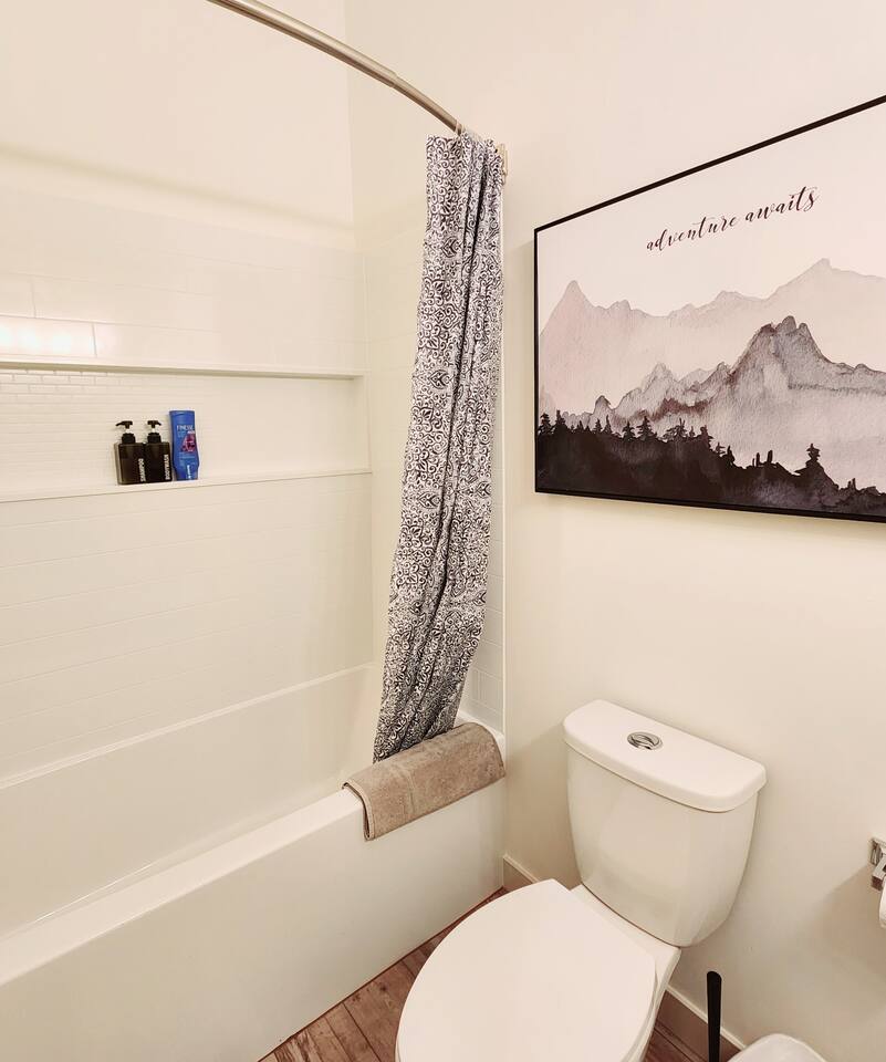 Townhouse | 800 Sqare Feet | Keyless entry Bedroom 1: Queen bed + foldable twin cot Bedroom 2: Queen bed Living room: Queen-size futon Luxury down filled duvets and memory foam mattresses ensure exceptional comfort. Fully Equipped Kitchen: Fridge, microwave, stove & oven, dishwasher, cookware, dishware, glassware, silver ware, brita, toaster, salt & pepper - cook and dine just like home. 2 Full Bathrooms: One with a tub-shower combo, one with a shower. Stocked with shampoo, conditioner, body soap, lotion, face wash, Dyson hair dryer, cotton pads, and more. Coffee bar: 12 cup drip coffee maker, ground coffee supplied. With the provided coffee beans and burr mill, why not take your time to enjoy an incredible coffee? Tea for tea lovers, and instant coffee to fuel busy mornings. Extra Comforts: In-suite laundry Smart TV Free parking High speed network for remote working Bedrooms with door locks for privacy Family-friendly: high chair & playpen Picnic table, Firepit and outdoor BBQ furnaces - shared among all guests in the resort